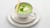 Aber für ein Süppchen – wie eines aus frischen Erbsen, serviert mit einem Mandelstick und gratiniertem Ziegenkäse – muss es nicht immer ein tiefer Teller sein ...