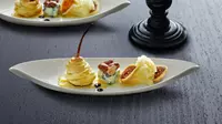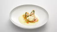 Und die großzügigen tiefen Fahnenteller eignen sich nicht nur für Suppen und Pasta: Auch Jakobsmuscheln mit frittierten Austern an Gurkenschaum lassen sich hierin sehen.